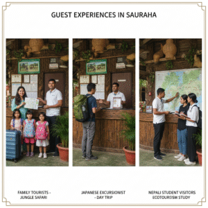 Scenario: A hotel in Sauraha, near Chitwan National Park, has three types of guests checking in on the same day. The first group is a family of four from Bangladesh who are tourists staying for three nights to do jungle safaris. The second is a solo Japanese traveler who is an excursionist; he just wants a place to store his bag for a few hours and have lunch before catching a bus back to Kathmandu in the evening. The third is a group of Nepali university students studying ecotourism, who are visitors on an educational trip. The front desk agent must handle each one differently, offering the family check-in details, the Japanese traveler a safe bag storage option and a lunch menu, and the students information about the park’s entry points.