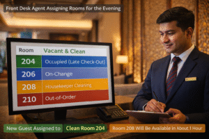 Scenario: A front desk agent in a Kathmandu hotel is assigning rooms for the evening. The system shows that Room 204 is Vacant and Clean, ready for a new guest. Room 206 is Occupied by a guest who has requested a late check-out. Room 208 is On-Change; the guest has just left, and the housekeeper is on her way to clean it. Room 210 is Out-of-Order because the air conditioner is broken. The agent assigns the new guest to Room 204 and notes that Room 208 will be available in about an hour. This clear communication ensures the new guest gets a perfect, ready room.